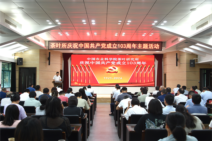 表彰儀式上,黨委委員任淑敏同志通報了2023年度研究所、部門(團隊)、個人獲上級榮譽表彰情況,黨委委員姚明哲同志宣讀了茶葉所2022-2023年度“兩優一先”表彰決定,所長姜仁華、黨委書記江用文共同為獲獎代表頒獎。最后,6名新黨員以及全體與會黨員面向黨旗宣誓,集體重溫了入黨誓詞。