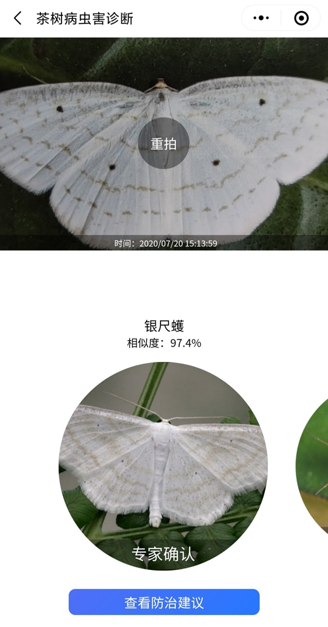 “茶病茶蟲”智能識(shí)別系統(tǒng)目前已覆蓋茶園間常見病蟲害、生理性病害及天敵130余種,農(nóng)戶可田間隨手拍照識(shí)別,系統(tǒng)將在數(shù)秒內(nèi)給出診斷參考,并提供專業(yè)防治建議,操作流程非常簡(jiǎn)單。